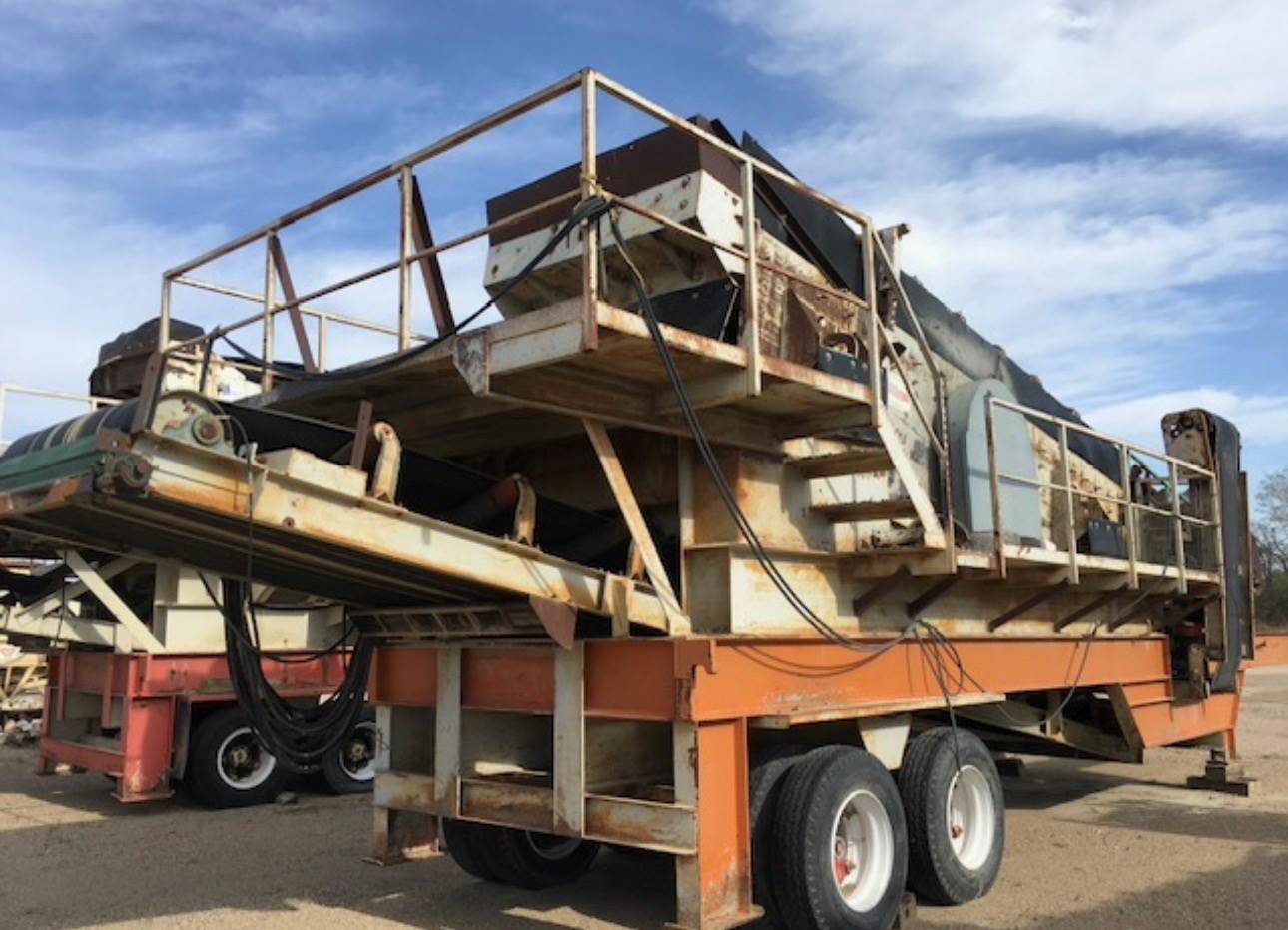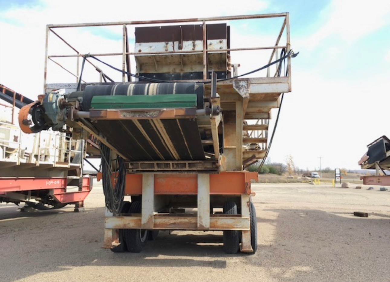 1992 PIONEER PORTABLE T/A 6'X20' 2 - DECK SCREEN, 36" OVERHEAD FEED CONVEYOR, 48' UNDER SCREEN CONVEYOR, 30 " TOP CROSS CONVEYOR, 30" BOTTOM CROSS CONVEYOR, URETHANE SCREEN TOP DECK, 30 HP SCREEN MOTOR, 10 HP SIZE 3 GEAR BOX TOP CROSS, 10 HP SIZE 3 GEAR BOX BOTTOM CROSS, 20 HP SIZE 4 GEAR BOX FEED CONVEYOR, 20 HP SIZE 4 GEAR BOX DISCHARGE CONVEYOR, NO BRAKES, NO LIGHTS, READY TO WORK