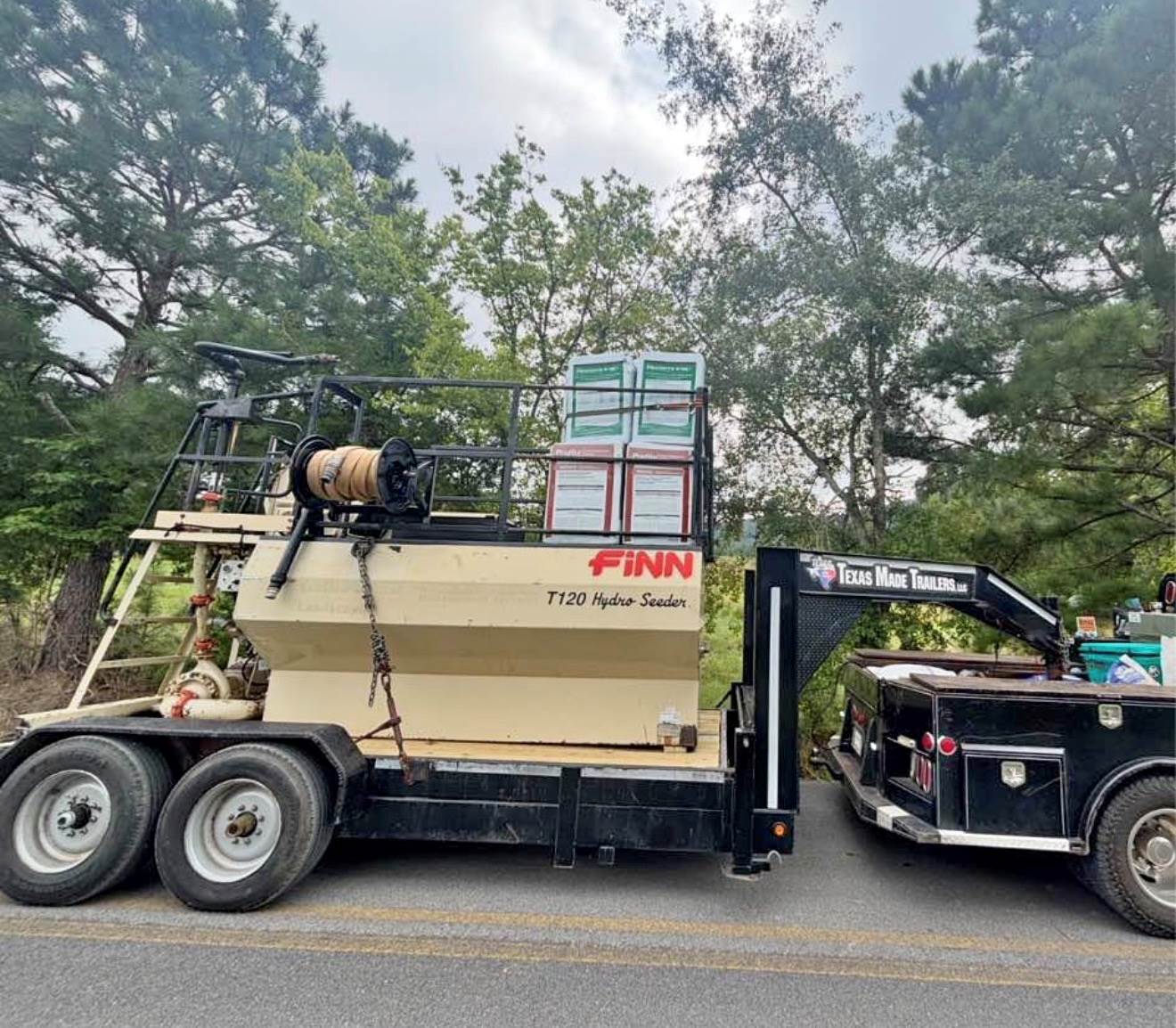 FINN T120GN HYDROSEEDER AND TRAILER, 700 HOURS, NEW PUMP SEALS AND GASKETS, NEW AUGER BEARINGS AND SEALS, MANY NEW HYDRAULIC HOSES, TANK WAS SANDED AND SPRAYED, MACHINE FULLY REDONE, RUNS AND SPRAYS GREAT, WORK READY.